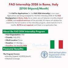 The call for applications for the FAO Internship 2026 is now open. International students can now apply for the FAO Internship 2026 at the FAO Headquarters in Rome Italy. Selected candidates will work at the FAO Headquarters and gain hands on experience in an international organization. The internship is open to currently enrolled undergraduate postgraduate and graduate students from FAO member countries. Interns will receive a monthly stipend of 700 dollars and medical services will also be provided throughout the program. All selected interns will receive this stipend for the full duration of the internship which lasts from 3 to 11 months. IELTS is not required for the application and there is no application fee. More information about the FAO Internship 2026 its benefits requirements and the application process is provided below.