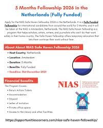 Applications are now open for the NIAS Safe Haven Fellowship 2026 in the Netherlands. This fully funded fellowship welcomes international candidates from all parts of the world. The program is offered by the Netherlands Institute for Advanced Study in the Humanities and Social Sciences. The duration of the fellowship is five months and it takes place at NIAS in Amsterdam from September to January or from February to June 2026.